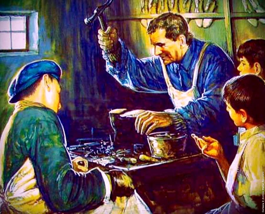 -1854, 39 años: Comienzan a crearse los talleres en Valdocco. Primero el de encuadernaciones, luego carpintería (1856), más tarde el de herrería (1862)...