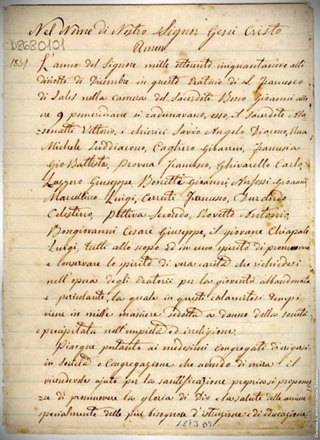 -1859, diciembre 18, 44 años: Nace la Congregación Salesiana, como Sociedad de San Francisco de Sales sus primeros integrantes 17 en total, en su gran mayoría son miembros de la Compañía de la Inmaculada fundada por el finado Domingo Savio.