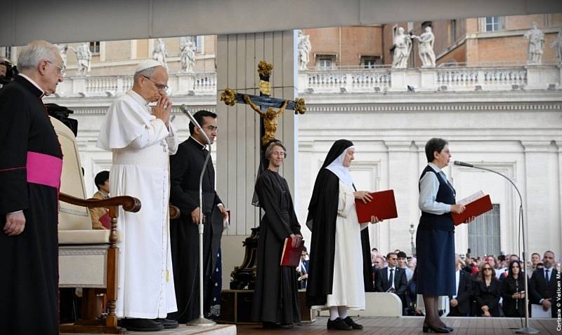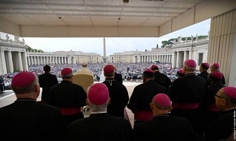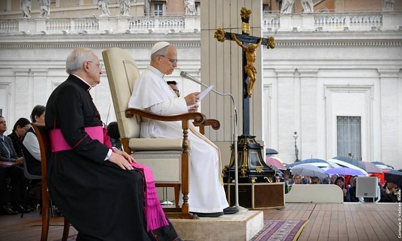 La Audiencia General de la mañana del miércoles 24 de septiembre de 2025, se desarrollo en la Plaza de San Pedro, el Santo Padre León XIV, tras saludar en el Aula Pablo IV a algunos fieles que por su edad o situación de salud, tuvieron que permanecer bajo techo, y luego de hacerse presente en el papamóvil entre las miles de personas reunidas en la Plaza, brindándoles su saludo y bendición, el Papa paso al frente del techado colocado como de costumbre en el atrio de la Basílica Vaticana, desde donde pronunció su catequesis en italiano.