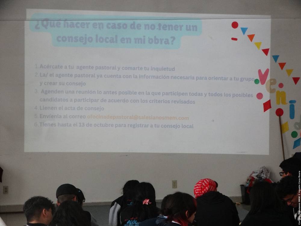 Recalcó la importancia de los Manuales de Animación del MJS, uno para cada etapa y el Manual de Organización, resaltó la posibilidad de que cada Consejo Local pueda solicitarlos a través del correo y medios de contacto con la Oficina de Pastoral. Además de presentaron los integrantes del Consejo del MJS Inspectorial, formado por jóvenes quienes se encargarán por regiones de coordinar, organizar las acciones y asegurar el seguimiento de las iniciativas pastorales coherentes y fieles con el Espíritu y Carisma Salesiano.
