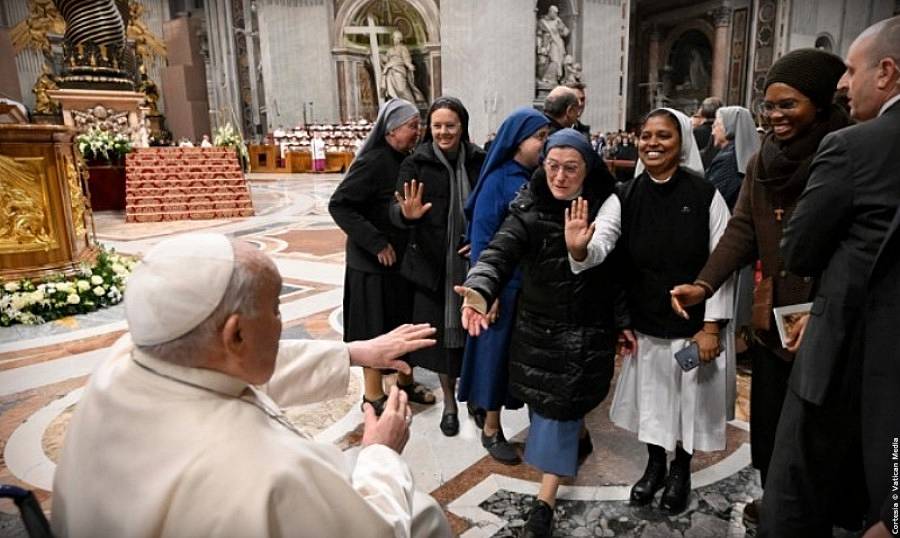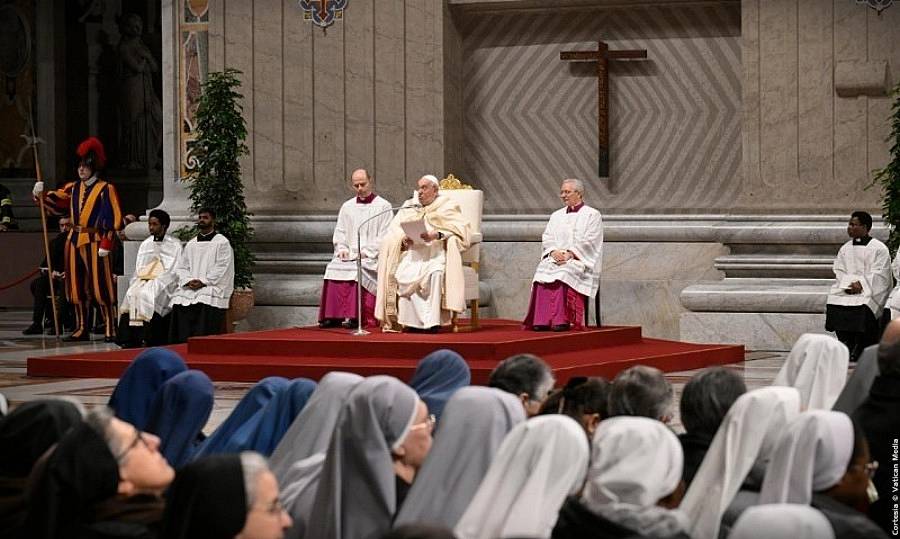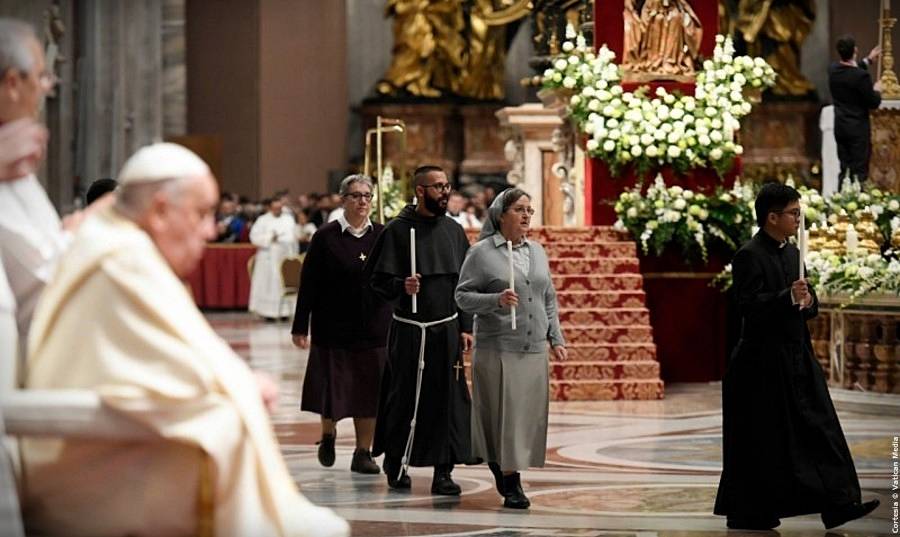 El sábado 1 de febrero de 2025, el Papa Francisco presidió las primeras vísperas de la fiesta de la Presentación del Señor y Jornada Mundial de la Vida Consagrada, durante el Jubileo de la esperanza, en la Basílica de San Pedro (Fuentes: Vatican News, Vatican Media, OPSS, Dicasterio para la Comunicación).