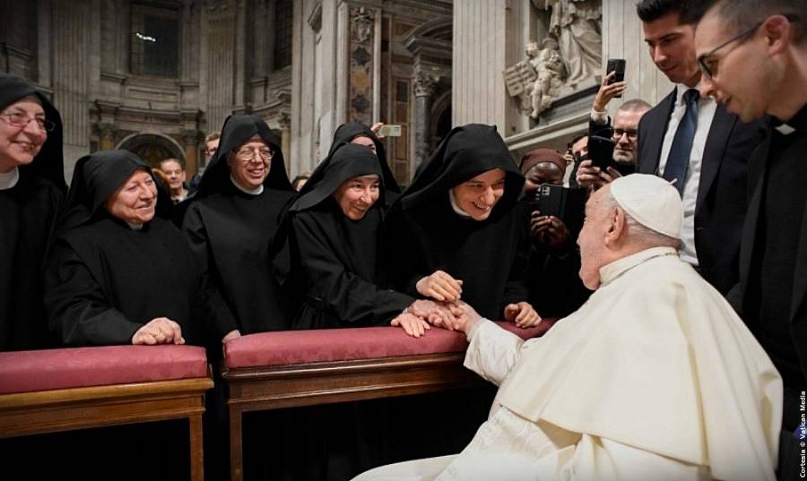 Y llegamos al tercer aspecto, que es la luz de la obediencia. También de ella nos habla el texto que hemos escuchado, presentándonos, en la relación entre Jesús y el Padre, la 'belleza liberadora de una dependencia filial y no servil, rica de sentido de responsabilidad y animada por la confianza recíproca' (Vita consecrata, 21). Es precisamente la luz de la Palabra que se hace don y respuesta de amor, signo para nuestra sociedad, que tiene la tendencia de hablar mucho y escuchar poco, en la familia, en el trabajo y especialmente en las redes sociales, donde nos podemos intercambiar cantidad de palabras y de imágenes, sin llegar nunca a conocernos realmente, porque no nos interesamos los unos por los otros. Y esto es interesante. Muchas veces, en el diálogo cotidiano, antes de que uno termine de hablar ya se salta con la respuesta. Y es que no se escucha. Tenemos que escucharnos antes de responder. Acoger la palabra del otro como un mensaje, como un tesoro, incluso como algo que me ayuda. La obediencia consagrada es un antídoto a tal individualismo solitario, promoviendo, en su lugar, un modelo di relación basado en la escucha efectiva, en la que al 'decir' y al 'oír' sigue la concretización del 'actuar', y esto aun a costa de renunciar a los propios gustos, programas y preferencias. En efecto, sólo de esta manera la persona puede experimentar al máximo la alegría del don, derrotando a la soledad y descubriendo el sentido de la propia existencia en el gran plan de Dios.