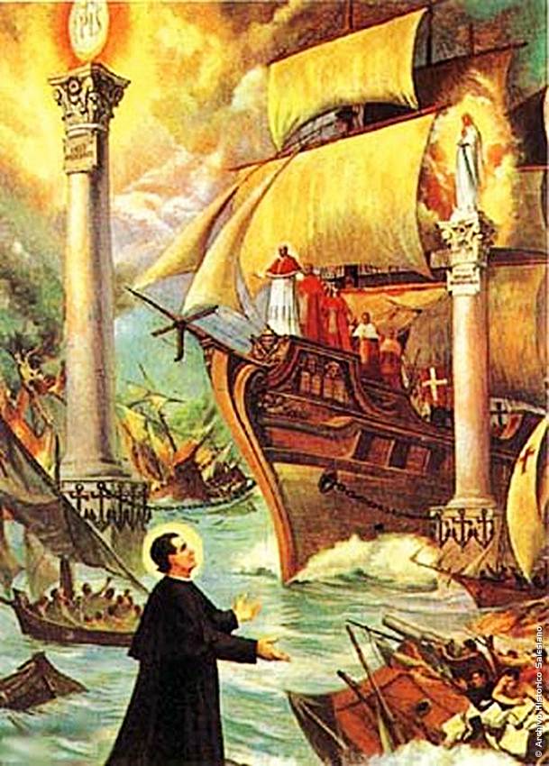 1862/mayo/30: Don Bosco describe el sueño de las dos columnas, expresando como el Papa y la Iglesia tiene en ellas su fortaleza, en la Eucaristía y la Santísima Virgen María. Ese mismo año comienza a nombrar con titulo de María Auxiliadora y comienza a narrar los milagros que se atribuyen a su intercesión, ante la invocación de su nombre.