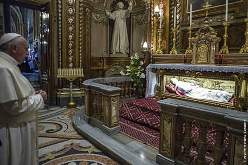 2015/ junio 21 y 22: El Papa Francisco en el marco de su visita a Turín, habla a los salesianos en la Basílica de María Auxiliadora y reza ante el cuerpo de Don Bosco, con motivo de hacerse cercano a su tierra de origen y a sus raíces salesianas, si bien el es Jesuita fue alumno salesiano en Argentina, y en el contexto de la celebración del Bicentenario ha pedido a los salesianos