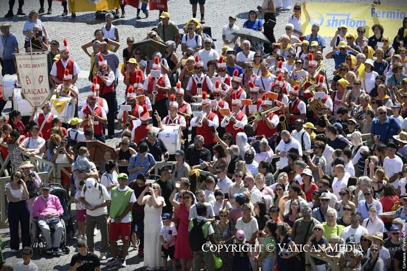 Saludo también a la Fraternidad Laical de las Hermanas Dimesse de Padua, a los jóvenes de Acción Católica y de AGESCI de Reggio Calabria, a los jóvenes de Gorla Maggiore y a los confirmandos de Castel San Pietro Terme; así como al Movimiento Shalom de San Miniato con la Filarmónica Angiolo del Bravo, a la Asociación ‘Note libere’ de Taviano y al grupo ‘Genitori Orsenigo’.