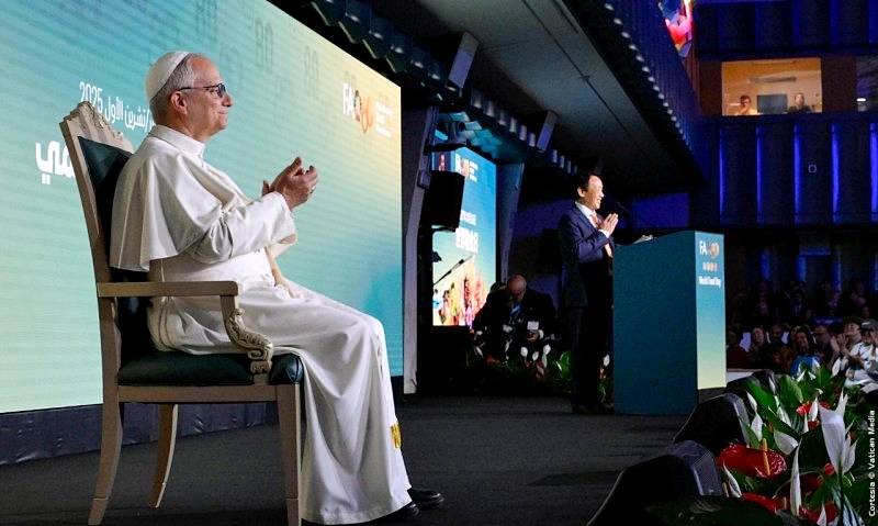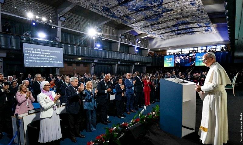 Destacó que, a pesar de los avances tecnológicos, 673 millones de personas aún enfrentan el hambre y 2300 millones no tienen acceso a una alimentación adecuada, lo que es un reflejo de una insensibilidad global. En este contexto, el Papa hizo un llamado a no olvidar las leyes del derecho internacional humanitario, que prohíben utilizar la inanición como arma de guerra, recordando que el hambre no es un destino inevitable, sino un escándalo que debe confrontarse con determinación.