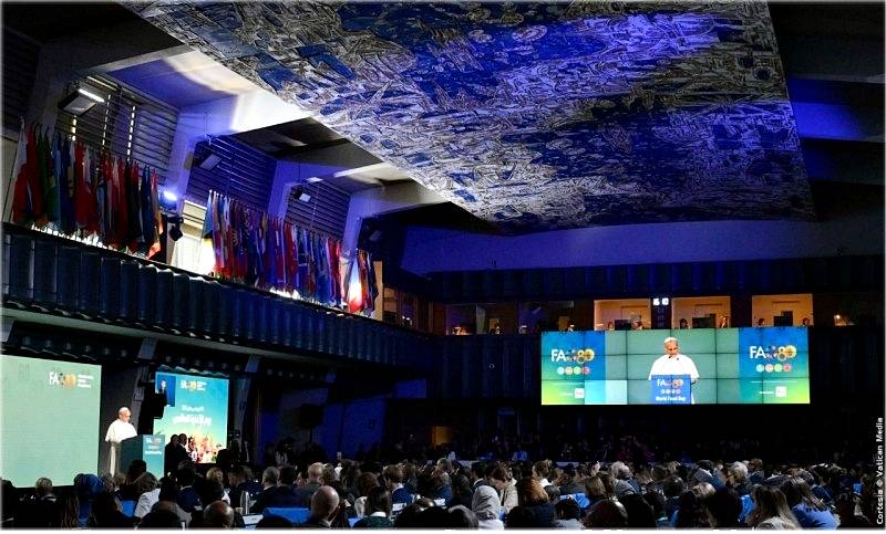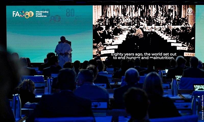 A ochenta años de la institución de la FAO, nuestra conciencia debe interpelarnos una vez más frente al drama -siempre actual- del hambre y la malnutrición. Poner fin a estos males incumbe no sólo a empresarios, funcionarios o responsables políticos. Es un problema a cuya solución todos debemos concurrir: agencias internacionales, gobiernos, instituciones públicas, oenegés, entidades académicas y sociedad civil, sin olvidar a cada persona en particular, que ha de ver en el sufrimiento ajeno algo propio. Quien padece hambre no es un extraño. Es mi hermano y he de ayudarlo sin dilación alguna.