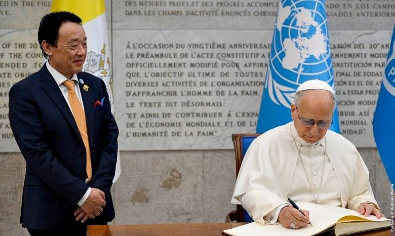 1. Permítanme, ante todo, expresar mi más cordial agradecimiento por la invitación a compartir esta memorable jornada con todos ustedes. Visito esta prestigiosa Sede siguiendo el ejemplo de mis Predecesores en la Cátedra de Pedro, que otorgaron a la FAO una especial estima y cercanía, conscientes del relevante mandato de esta organización internacional.