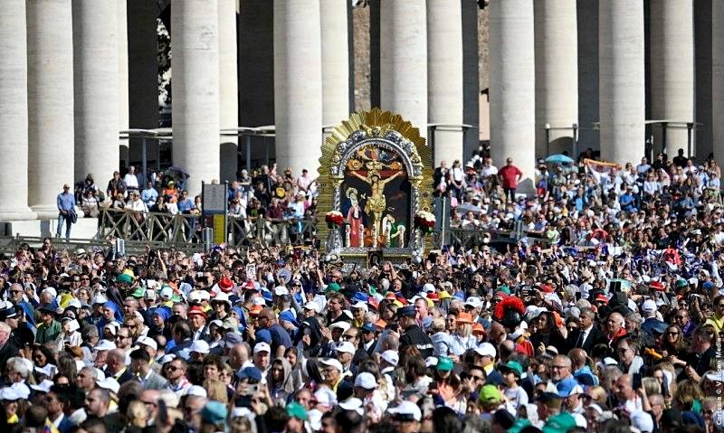 Extiendo mi saludo a los demás peregrinos presentes, en particular a la Hermandad del Señor de los Milagros, que ha celebrado su tradicional procesión.