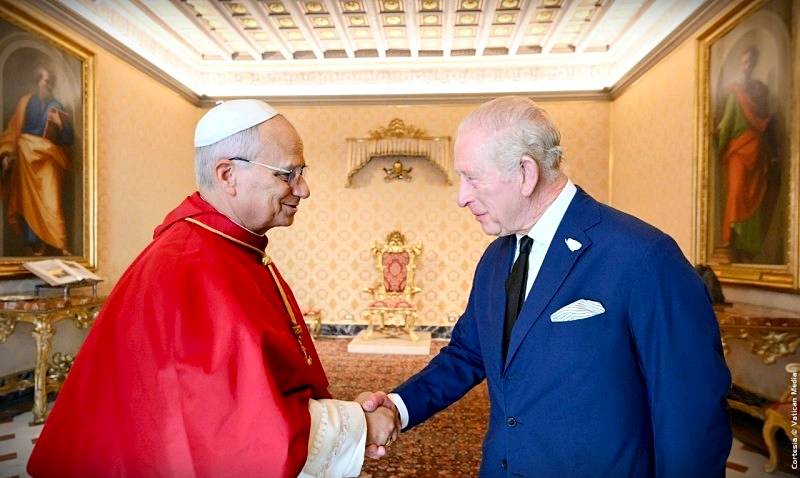 De acuerdo al Comunica de Oficina de Prensa de la Santa Sede el Papa celebró en el Palacio Apostólico Vaticano, durante la mañana del 23 de octubre de 2025, el Santo Padre León XIV sostuvo primero una Audiencia Privada con Sus Majestades el Rey Carlos III y la Reina Camila del Reino Unido. Tras esta reunión, su majestad el Rey Carlos III se reunió con el Emmo. Card. Pietro Parolin, secretario de Estado de Su Santidad, acompañado por Su Excelencia Monseñor Paul Richard Gallagher, Secretario del Vaticano para las Relaciones con los Estados y las Organizaciones Internacionales.
