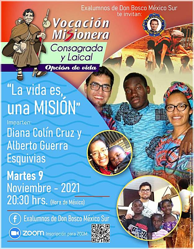 Los Delegados Inspectoriales para la Familia Salesiana de México Sur (MEM y MME) y los Exalumnos de Don Bosco México Sur, en le marco del ciclo de conferencia "Vocación misionera consagrada y laical: opción de vida", tienen el placer de invitarles el martes de Don Bosco 9 de noviembre de 2021, a participar en la videoconferencia "La vida es una Misión".