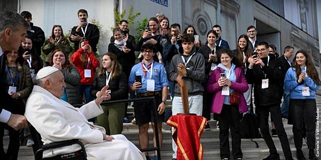 Y, una vez que estamos de pie, depende de nosotros permanecer de pie. Por primera cosa levantarse y luego ponerse de pie, ‘permanecer’ cuando nos apetece sentarnos, soltarnos, dejarnos llevar. No es fácil, pero es el secreto. Sí, el secreto de los grandes logros es la constancia. Es cierto que a veces existe esa fragilidad que te arrastra hacia abajo, pero la perseverancia es lo que te hace avanzar, es el secreto. Hoy vivimos de emociones rápidas, de sensaciones momentáneas, de instintos que duran instantes. Pero así no se llega lejos. Los campeones deportivos, así como los artistas, los científicos, demuestran que los grandes logros no se alcanzan en un momento, de golpe. Y si esto es cierto para el deporte, el arte y la cultura, con mayor razón lo es para lo que más cuenta en la vida. ¿Que cuenta en la vida? El amor, La fe. Y para crecer en la fe y en el amor, debemos tener perseverancia y seguir siempre adelante. En cambio, aquí el riesgo es dejarlo todo a la improvisación: rezo si me apetece, voy a misa cuando me apetece, hago cosas buenas si me apetece... Esto no da resultados: hay que perseverar, día tras día. Y hacerlo juntos, porque el hacerlo juntos nos ayuda a avanzar. Juntos: el ‘hazlo tú mismo’ en las cosas grandes no funciona. Por eso les digo: no se aíslen, busquen a los demás, experimenten a Dios juntos, sigan caminos de grupo sin cansarse. Quizá digas: ‘Pero todos los que me rodean están solos con sus móviles, pegados a las redes sociales y a los videojuegos’. Y tú, sin miedo, vas contracorriente: toma la vida en tus manos, ponte en juego; apaga la tele y abre el Evangelio – ¿es esto demasiado? -, deja el móvil y ¡encuéntrate con la gente! El teléfono móvil es muy útil, para comunicarse, es útil, pero ten cuidado cuando tu teléfono móvil te impida conocer gente. Usa el móvil, está bien, pero ¡conoce gente! Ya sabes lo que es un abrazo, un beso, un apretón de manos: gente. No lo olviden: usen el móvil, pero conozcan gente.
