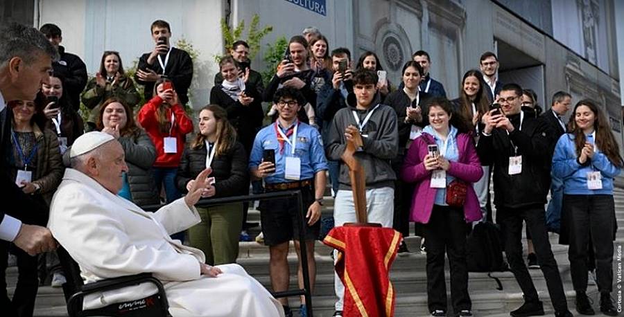 Pensemos en nuestro Padre, que creó todo para nosotros, Dios nos ha dado todo: y nosotros que somos sus hijos, ¿para quién creamos algo bello? Vivimos inmersos en productos hechos por el hombre, que nos hacen perder el asombro por la belleza que nos rodea, sin embargo, la creación nos invita a ser creadores de belleza a nuestra vez, y a hacer algo que antes no existía. ¡Esto es hermoso! Y cuando se casen y tengan un hijo, una hija, ¡habrán hecho algo que antes no existía! Y ésta es la belleza de la juventud, cuando se convierte en maternidad o paternidad: hacer algo que antes no existía. Esto es hermoso. Piensen en su interior en los hijos que tendrán, y esto debe empujarnos hacia adelante, no sean profesionales del tecleo compulsivo, ¡sino creadores de novedad! Una oración hecha con el corazón, una página que escribes, un sueño que realizas, un gesto de amor hacia alguien que no puede corresponderte: esto es crear, imitar el estilo de Dios que crea. Es el estilo de la gratuidad, que te saca de la lógica nihilista del ‘hago para tener’ y del ‘trabajo para ganar’. Esto hay que hacerlo -hago para tener y trabajo para ganar-, pero no debe ser el centro de tu vida. El centro es la gratuidad: den vida a una sinfonía de gratuidad en un mundo que busca el beneficio. Entonces serán revolucionarios. ¡Adelante, entrégate sin miedo!