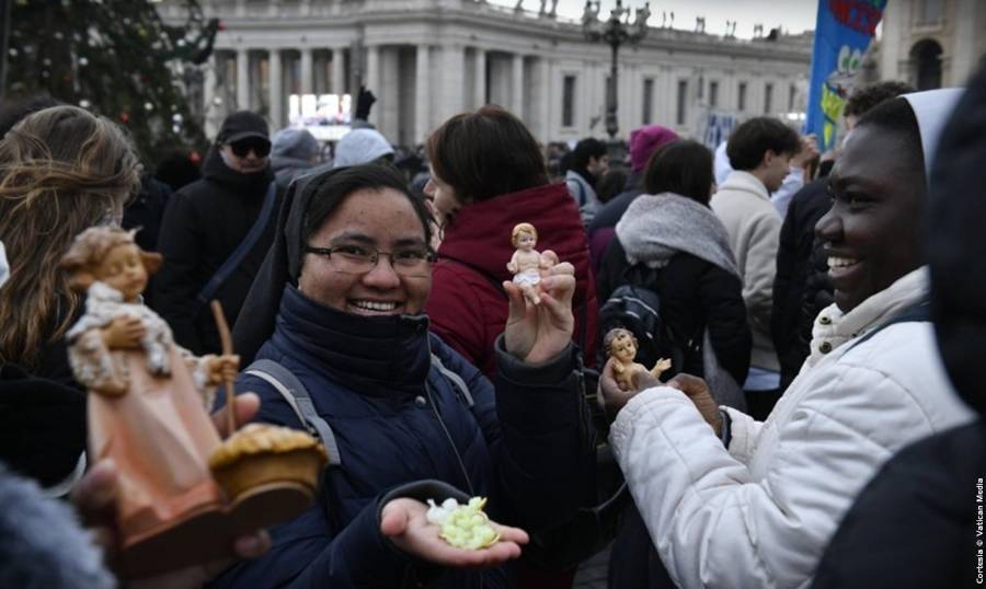 Y ahora bendigo a las imágenes del ‘Niño Dios’, yo he traído el mío, las figuritas del Niño Jesús que ustedes, queridos niños y jóvenes, han traído aquí y que pondrán en el pesebre al regresar a casa. Les agradezco este gesto sencillo, pero importante. Los bendigo de corazón a todos, a sus padres, a sus abuelos, a sus familias. Y, por favor, ¡no se olviden de sus abuelos! Que nadie esté solo estos días.