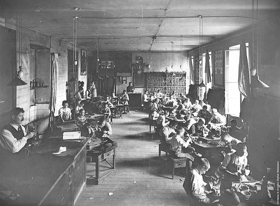 -1854, 39 años: Comienzan a crearse los talleres en Valdocco. Primero el de encuadernaciones, luego carpintería (1856), más tarde el de herrería (1862)...
