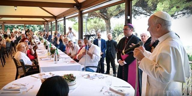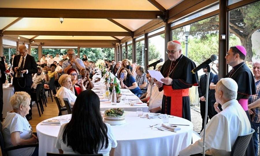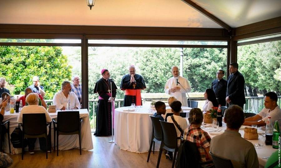 El XX Domingo del Tiempo Ordinario, 17 de agosto de 2025, en Jardines de las Villas Pontificias de ‘Castelgandolfo e la Villa Laudato si’ ‘, el Papa León XIV participó en una comida con los pobres que asiste la Diócesis de Albano y con los trabajadores de Cáritas Diocesana de la localidad, ha todos ellos les ha recordado que todos hemos sido creados a imagen y semejanza de Dios, y enfatizó que comer juntos es un acto de unidad y amor.