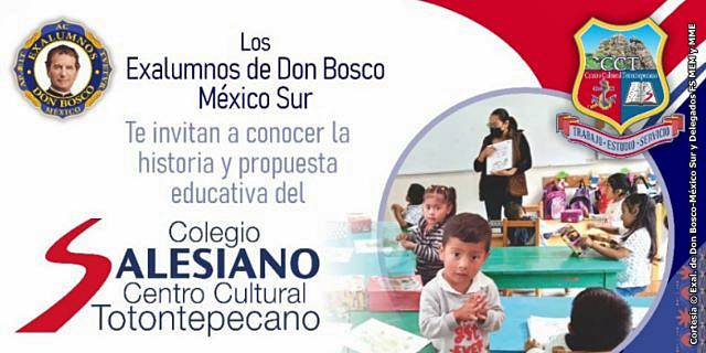 Con motivo del cierre y conclusión del 5º ciclo de conferencias-entrevistas "Instituciones educativas salesianas: sembrando el carisma de Don Bosco", en los ‘Martes de Don Bosco’, los delegados para la Familia Salesiana de MEM y MME, en colaboración con los Exalumnos de Don Bosco de México Sur, les invitan a participar el próximo 19 de julio de 2022, a las 20:30 horas, -tiempo de la ciudad de México-, a la presentación del Colegio Salesiano Centro Cultural Totontepecano, ubicado en la sierra Mixe de Oaxaca.